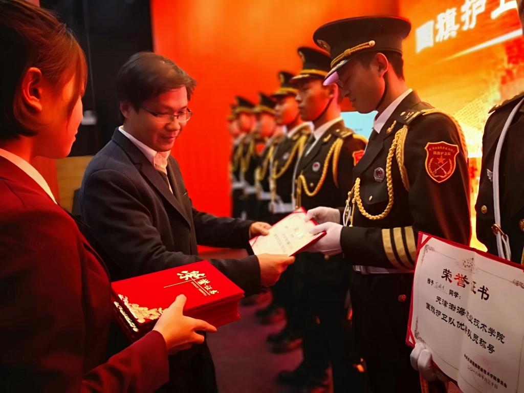团委书记李贤宇宣读了《关于表彰天津渤海职业技术学院国旗护卫队优秀队员的决定》,指导教师刘云龙对国旗护卫队成立以来的训练和活动情况进行了总结和点评。会上,举行了隆重的颁奖仪式,宋雪瑞等三位同学代表获奖队员做了典型发言。