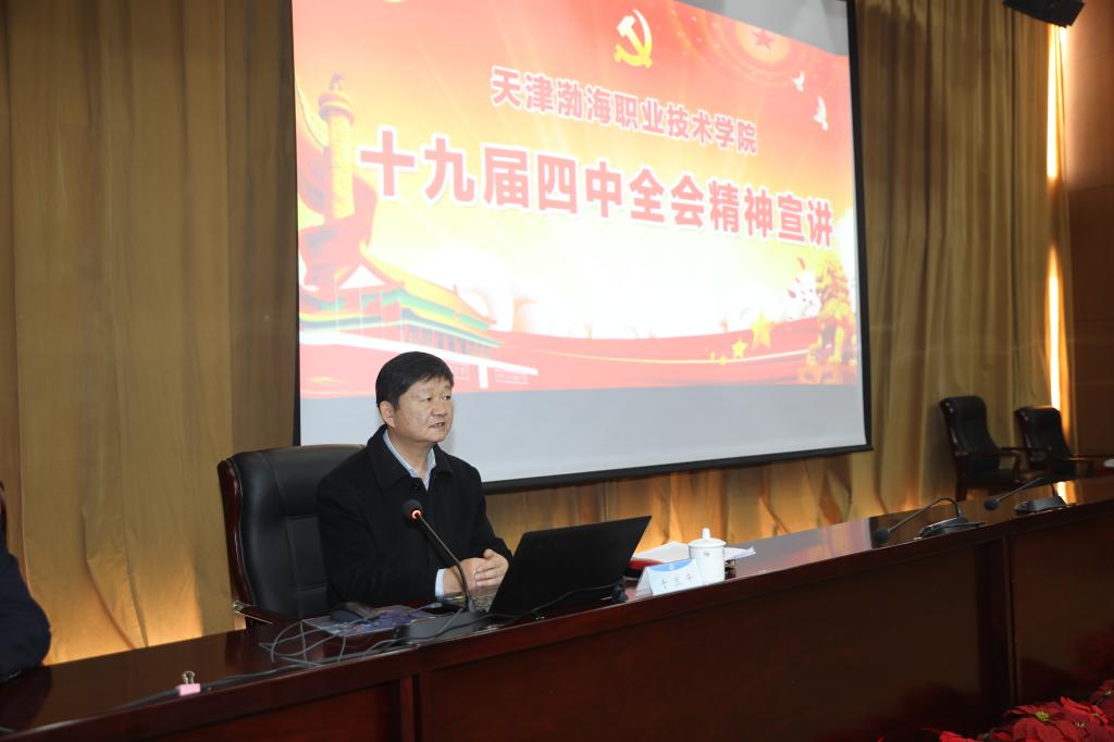 于兰平着重介绍了党的十九届四中全会重要意义,用生动形象的比喻、朴实无华的语言以及通俗易懂的论证,深入浅出的就《中共中央关于坚持和完善中国特色社会主义制度、推进国家治理体系和治理能力现代化若干重大问题的决定》做了阐释,就充分认识坚持和完善中国特色社会主义制度、推进国家治理体系和治理能力现代化的重大意义等五个方面的问题做了解读,并就如何贯彻落实全会的部署要求,以及如何加强完善学院双高校建设和文明校园建设提出了要求和希望。
