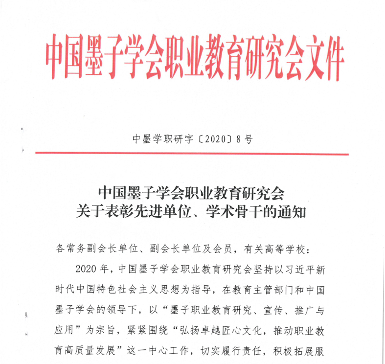 近日获悉,学院荣获中国墨子学会职业教育研究会2020年先进单位称号。