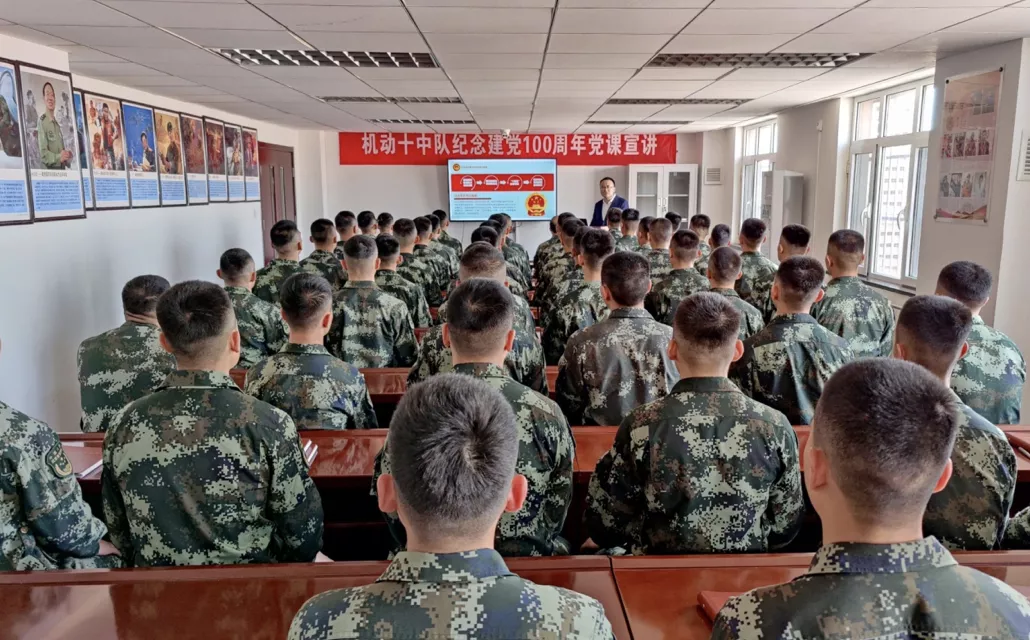 为进一步发挥思政课教师专业特长,更好服务社会,对标“双高”建设要求,落实学院党委“党课基层宣讲”部署,4月7日,学院思政教学部组织教师深入武警天津总队机动十中队,以《百年大党 百年辉煌》为题,为50余名官兵上了一堂生动的专题党课。党课以习近平总书记在党史学习教育动员大会上的重要讲话为引语,围绕“中国共产党和人民军队建设”,从学习党史中感悟中国革命和自我修炼中践行初心使命两个方面递次展开,回顾了中国共产党走过的100年光辉奋斗史;引导官兵全面、准确地理解中国特色社会主义进入新时代的依据、内涵和意义,增强官兵对新时代中国特色社会主义的政治认同、思想认同、情感认同;号召官兵牢记初心使命、坚定理想信念,自觉从百年党史中汲取保家卫国的智慧和力量。