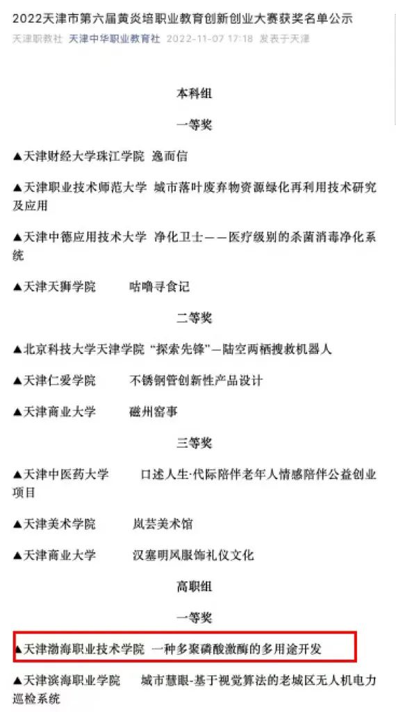 为积极搭建渤海学子创新创业平台载体,引导我院学生学习创新创业知识,培养创新创业意识,树立创业精神,提高创新创业能力,学院积极落实《天津市第六届黄炎培职业教育创新创业大赛的通知》要求。自备赛以来,学院领导高度重视、积极组织,在指导教师和参赛学生的共同努力下,学院共有两个项目参加天津中华职业教育社11月4日举办的天津市第六届黄炎培职业教育创新创业大赛决赛。在疫情防控的特殊时期,比赛严格履行入校流程,现场严格执行扫码、测温、提供健康码行程码及24小时核酸报告,做到科学防控。本次大赛采取线上线下相结合的方式进行,共计33个项目参加决赛,其中11个项目线上参赛。各参赛团队高度重视、精心准备、精细打磨商业计划书,以饱满的激情参加比赛,通过路演答辩全面展示项目内容。今年大赛参赛的项目具有创新性强、技术壁垒高、市场前景广阔的特点,为我们呈现了一场精彩的双创盛宴。通过层层比拼选拔,最终来自环境与化工学院的《一种多聚磷酸激酶的多用途开发》项目荣获一等奖,信息工程学院的《Smart Link智联》荣获二等奖,学院荣获第六届黄炎培职业教育创新创业大赛优秀组织奖。