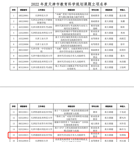 近日,天津市教育科学规划领导小组办公室发布了《2022年度天津市教育科学规划课题立项名单》(津教科规办〔2022〕11号),2022年度天津市教育科学规划课题,经全市各类院校公开申报、形式审查、专家组评审,共获批重点课题立项19项。学院“新时代劳动综合育人功能研究”课题获批重点课题。